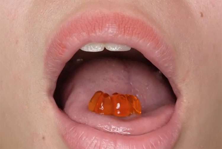 3.グミ丸呑みグミを人間に見立ててお口の中に入れてもらい、ベロや歯などでいじくりまわしてから咀嚼して飲み込むところを撮影しました!