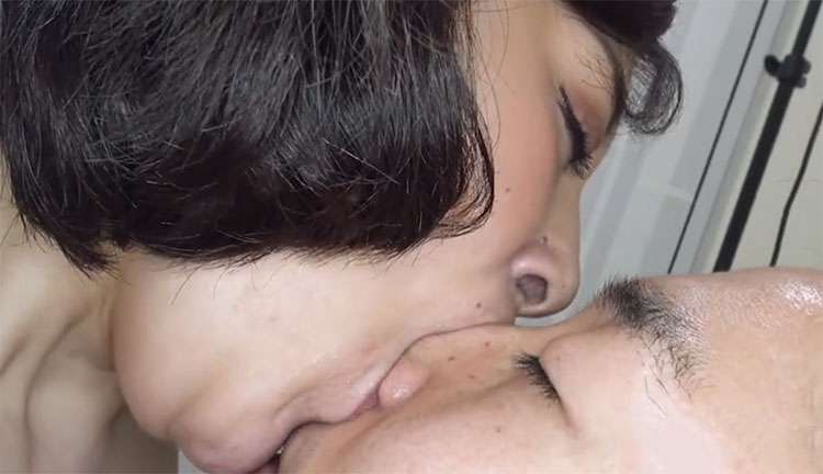 そして、舌ベロで顔面を舐められながらチンポをビンビンにする変態くん。すかさず彩香さんがよだれをチンポにべっちょりかけて手コキ攻め!!
